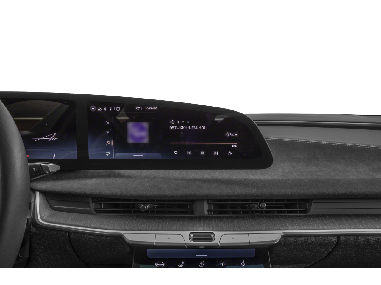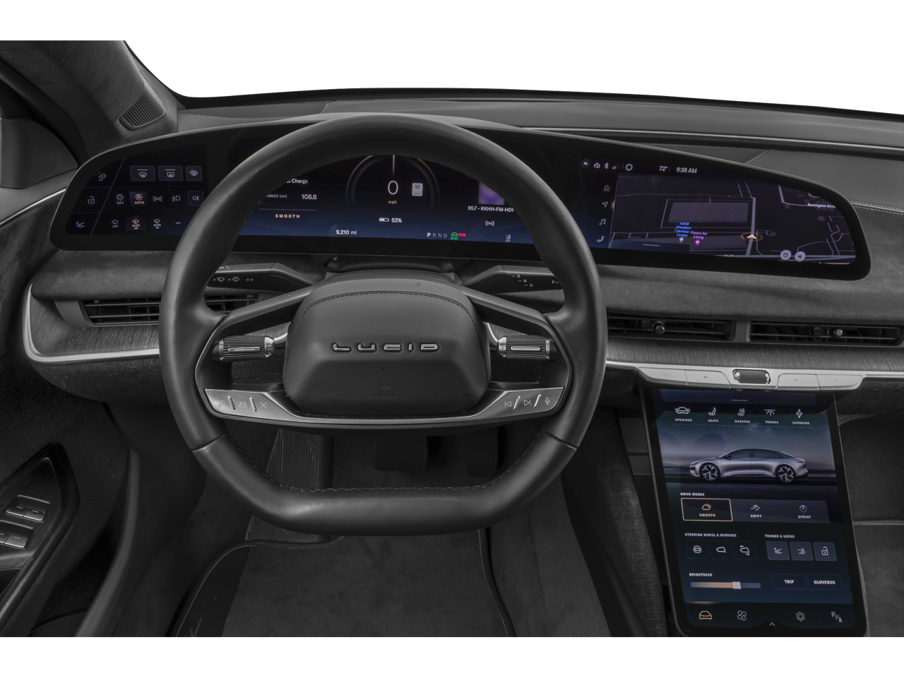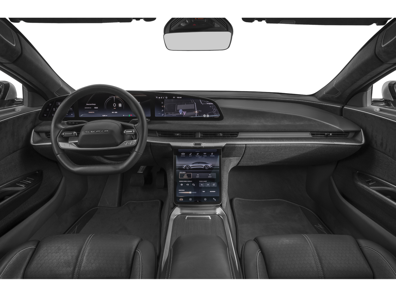 - Radio: AM/FM/HD w/Surreal Sound Audio -inc: 9 speakers, 34" glass cockpit center information driver display, 12.5" power-retractable pilot panel touchscreen display, native support for streaming apps (Spotify, iHeartRadio, TuneIn, Pocket Casts and Tidal), speed-sensing automatic volume control, Lucid assistant voice control system, USB-A and USB-C ports in front seats and Bluetooth wireless technology